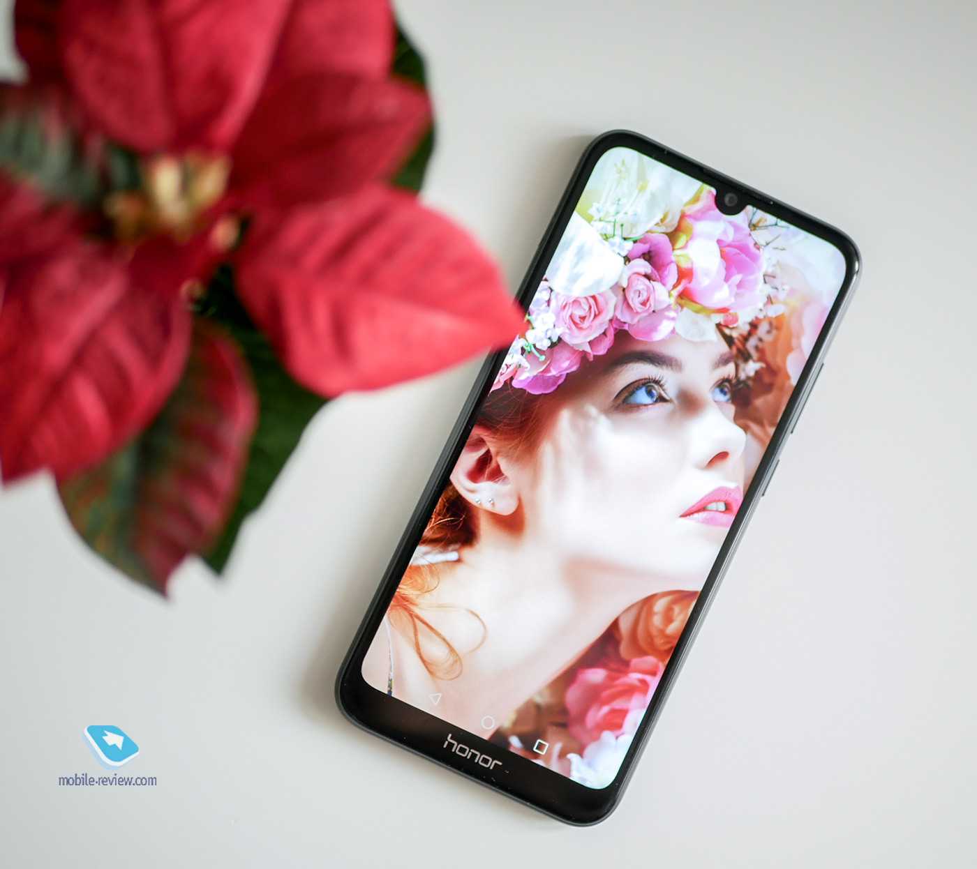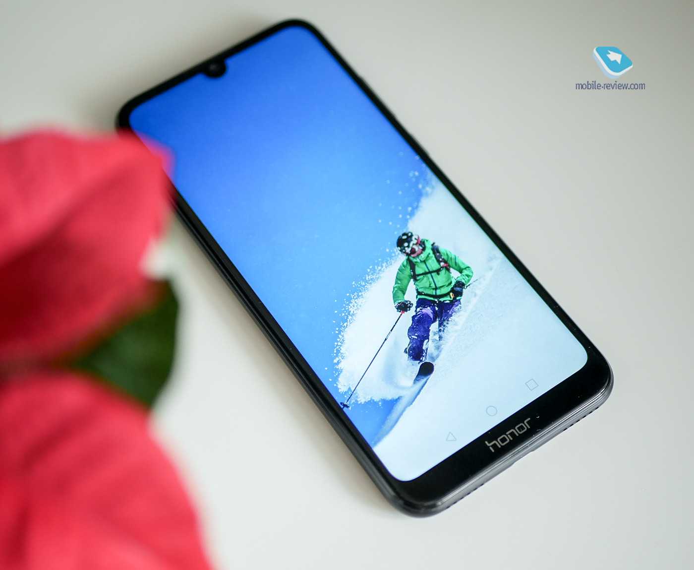 Спереди – в первую очередь, экран. Это 6,088″ панель с разрешением 1560х720 точек (HD+, 19,5:9), выполненная по технологии IPS. Экран неплохой – с довольно точной цветопередачей, широким диапазоном яркости и максимальными углами обзора. Несколько огорчает качество десятипальцевого тачскрина: он сбоит, если два пальца находятся на одной вертикальной линии. Это может быть неприятным сюрпризом в играх, где управление основано на двух джойстиках (например, PUBG или Shadowgun Legends). Спереди ещё стоит отметить логотип Honor и светодиодный индикатор.