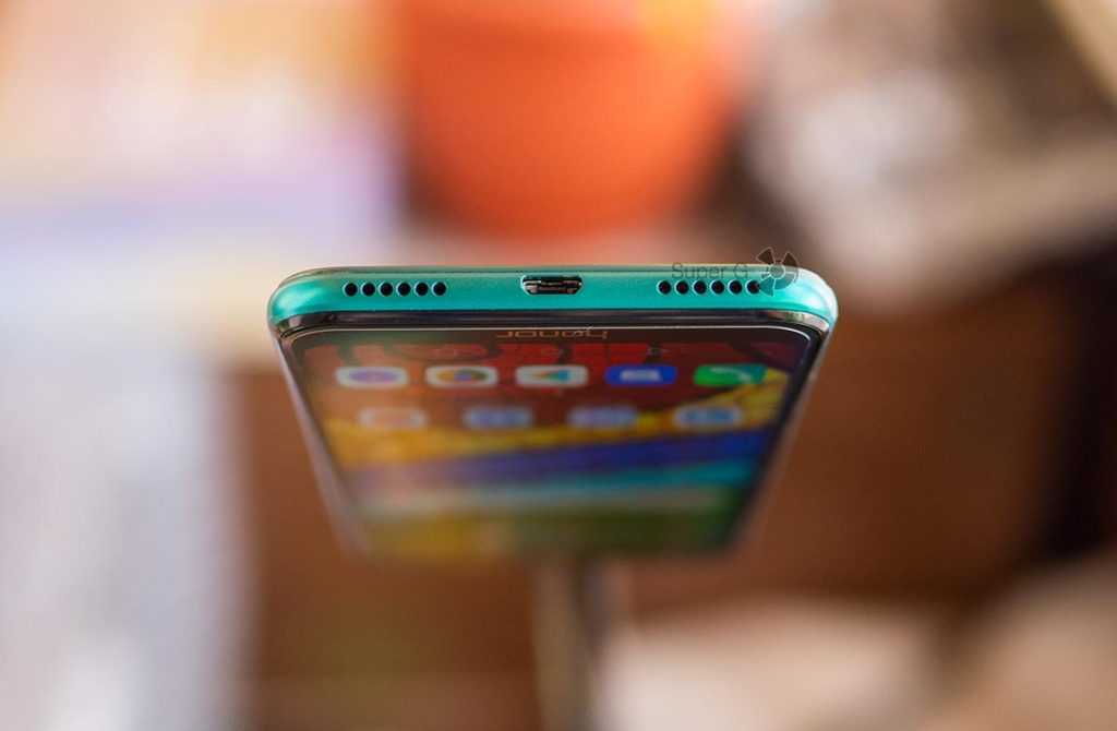 Нижний торец с шестью круглыми отверстиями — слева установлен микрофон, а справа есть мультимедийный динамик. Между ними по центру — старый порт microUSB. Понятно, что в таком бюджете пока современный Type-C не ставят. Верхняя грань комплектуется 3,5-мм аудиоразъемом и дополнительным микрофоном.