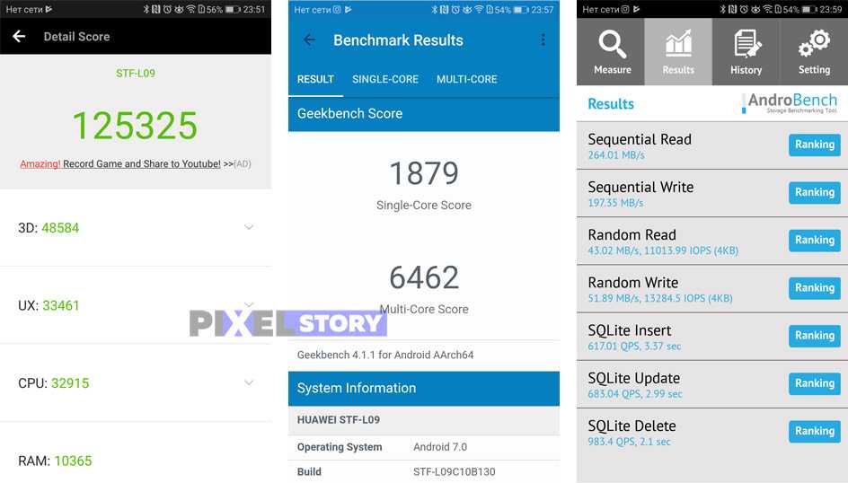 Удручает в начинке Honor 9 лишь одно — производитель сэкономил на модуле встроенной памяти. В тесте AndroBench скорость чтения не переваливает за 300 Мб/сек, а в держится на отметке 200 Мб/сек. Скорость встроенной памяти Honor 9 явно не дотягивает до стандарта UFS 2.0.