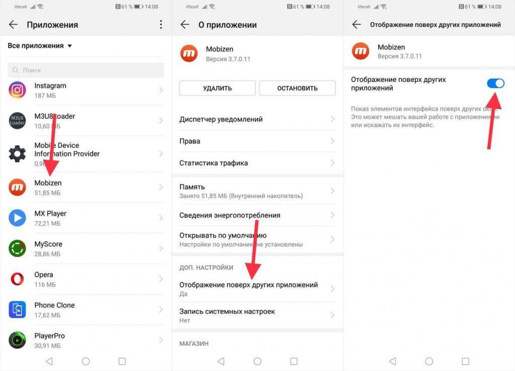 - Откроется меню настроек с нужной функцией. Здесь можно выбрать желаемое приложение и активировать функцию с помощью ползунка «Показывать поверх других приложений».