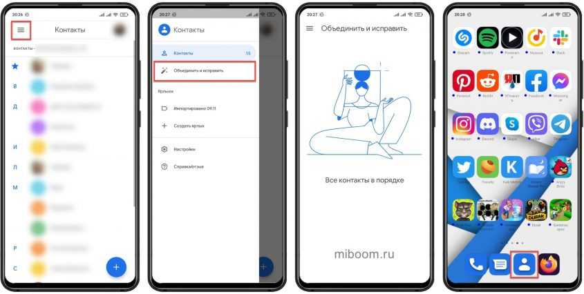 В смартфонах Xiaomi на MIUI вы найдете эту опцию в приложении «Контакты». Для этого откройте Контакты → Долгое нажатие на кнопку меню → Дополнительно → Объединение дубликатов.