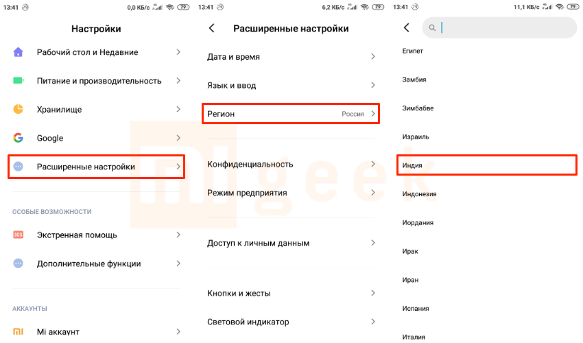 - Сначала нужно выставить регион устройства как «Индия». Для этого перейдите в настройки, пункт «Расширенные параметры» — «Регион» и выберите нужную страну. Не стоит волноваться, если смартфон начнет «жить своей жизнью», устанавливая игры и приложения — их можно удалить позже.