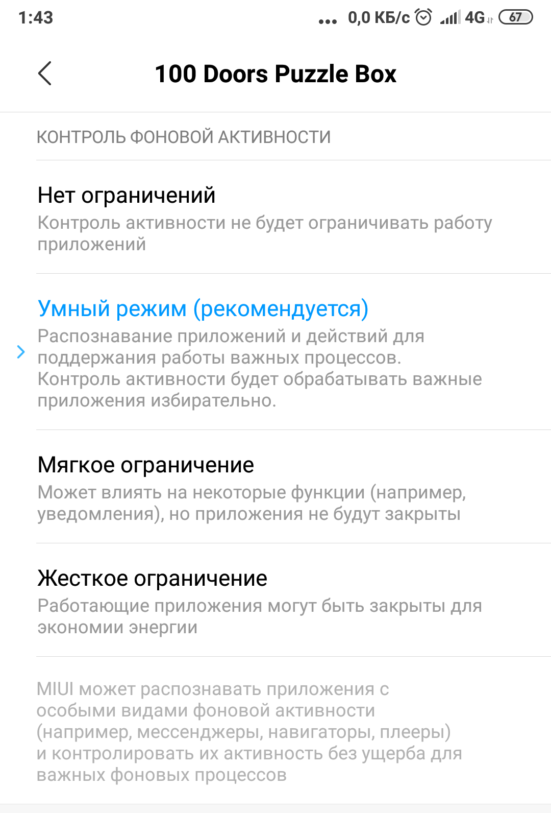 Найдите приложение, которым вы редко пользуетесь, и откройте его. Вам предложат четыре варианта режима: без ограничений, “умный”, мягкое ограничение и жесткое. Для основных программ оставьте “умный контроль”. Если приложение открывается редко, рекомендуется жесткий режим. Он закрывает ненужные ресурсы, которыми вы редко пользуетесь.
