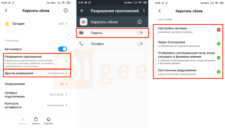 - Перейдите в «Разрешения приложений» и дайте абсолютно все разрешения карусели;