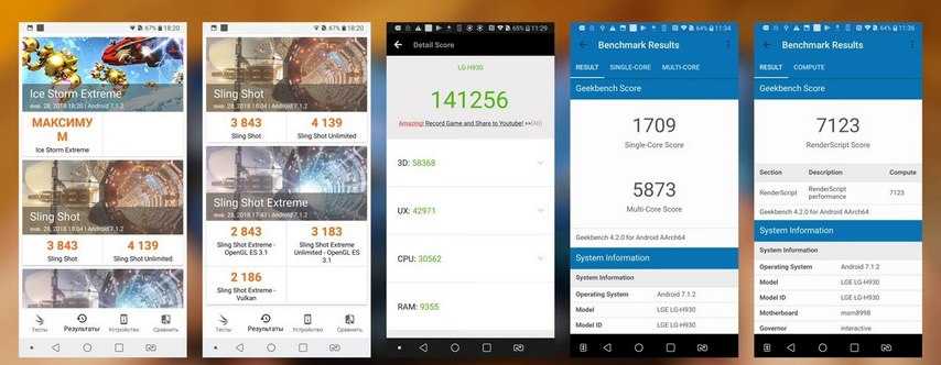 В синтетических тестах смартфон LG V30 демонстрирует очень хорошие показатели. В AnTuTu устройства набирает 153 тысячи «попугаев», что является четвертым показателем после Note 8, Nokia 8 и нового Apple X. Другой тест, Geekbench, демонстрирует мощность процессора в 6348 баллов при многоядерном режиме и 1927 при работе одного ядра.