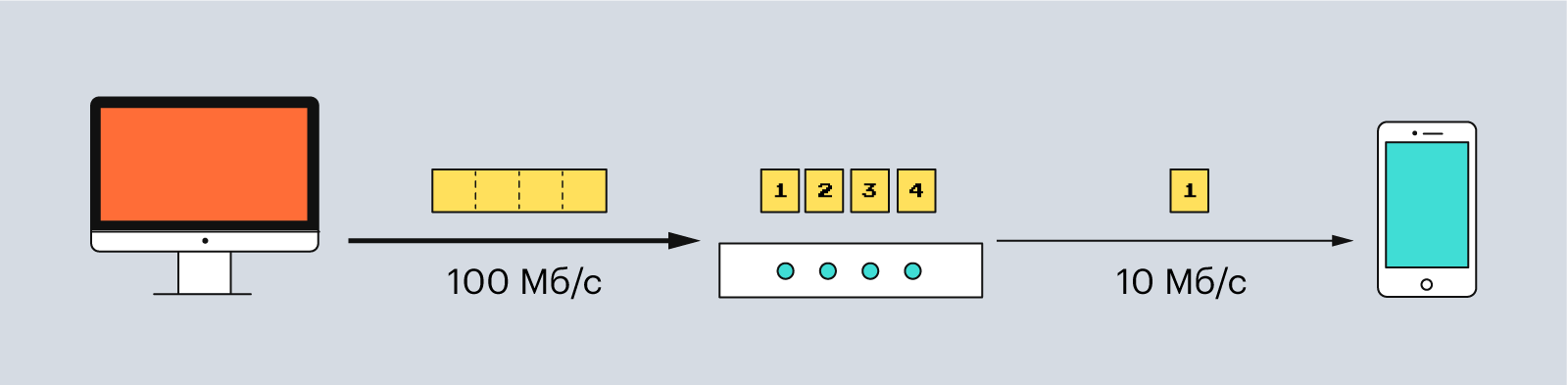 Например, если вы передаёте данные с компьютера, у которого пропускная способность 100 Мб/c, на смартфон с пропускной способность 10 Мб/c, то данные разделятся так, чтобы не застревать в самом медленном устройстве.