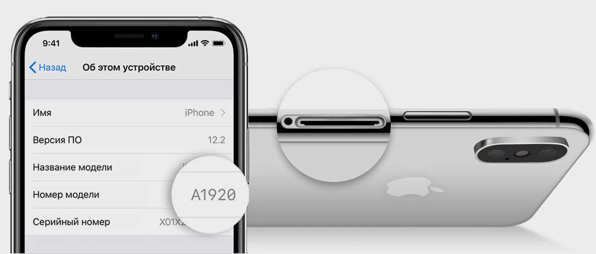 Найти данные о модели смартфона можно на коробке устройства, на внутренней стороне корпуса под лотком для SIM-карты и в параметрах (Настройки – Основные – Об этом устройстве).