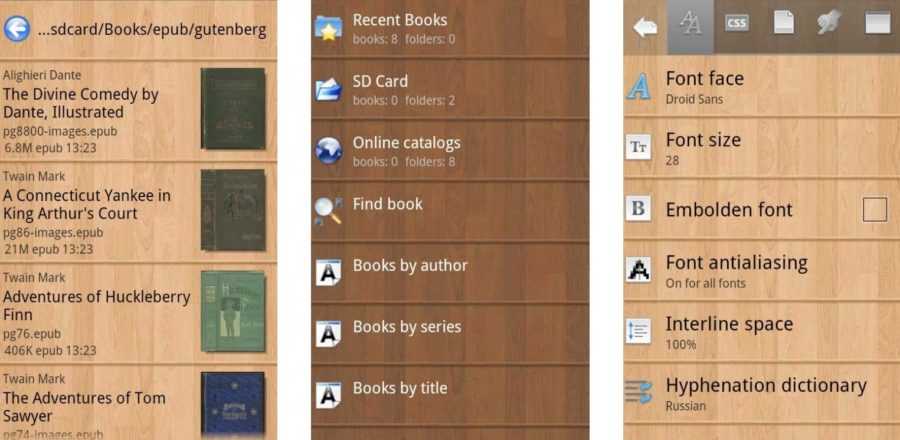 Эта программа не содержит лишних настроек — её интерфейс крайне прост, а дизайн минималистичен. Aldiko Book Reader поддерживает минимум текстовых форматов, но стабильно работает даже на ранних версиях Android.