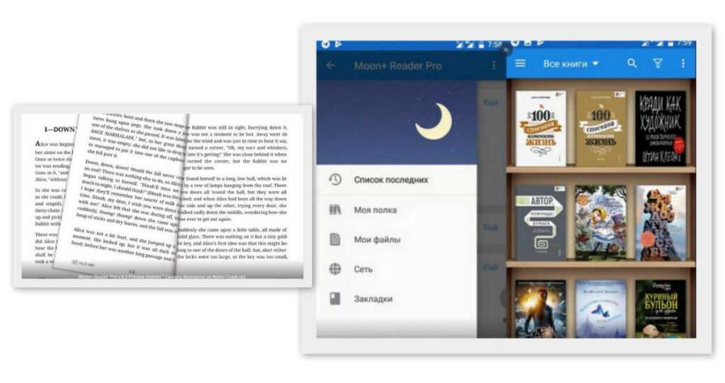 Moon+ Reader – удобная и многофункциональная читалка на Андроид. Она поддерживает все популярные форматы. Самое интересное – это инструмент для изменения интерфейса. Программу внутри можно поменять кардинально так, чтобы чтение проходило максимально комфортно. Тут можно менять не только виды или типы шрифтов, но также интервалы, размеры пробелов, переносы, отступы и так далее. Если же вы будете слишком долго читать, на экране высветится уведомление о необходимости отдыха. Плюс тут предусмотрен фильтр синего цвета.