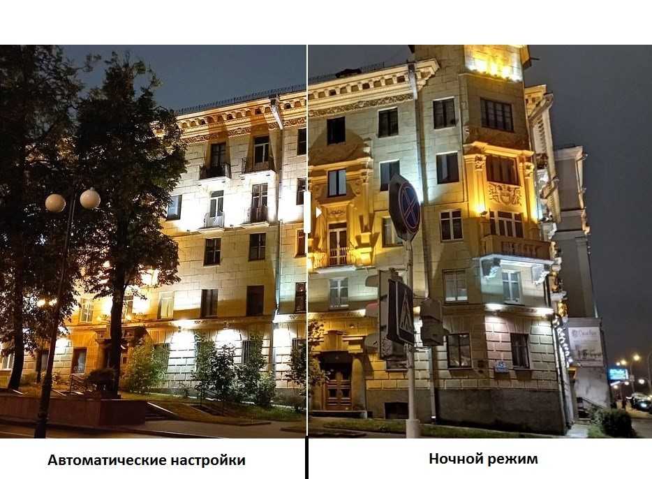 Однако если объект, снимаемый ночью, имеет хорошую подсветку, то даже на автоматических настройках можно получить фото приемлемого качества. Разница между «Ночным режимом» и режимом «По умолчанию» будет почти незаметной.