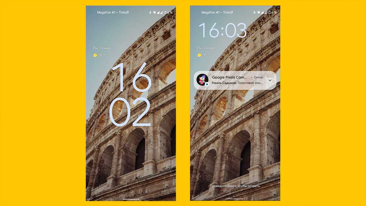 Привычные элементы стали больше, и это можно заметить сразу по циферблату на экране блокировки, который теперь занимает где-то треть площади дисплея и находится посередине, если нет уведомлений. А если они есть, то часики уходят в верхний левый угол, в котором всегда находится дата и погода.