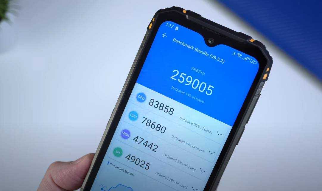 В бенчмарке AnTuTu смартфон набирает порядка 260 тысяч баллов. По меркам защищенной лиги результат солидный. Немногие устройства по такой стоимости могут похвастаться схожим результатом.