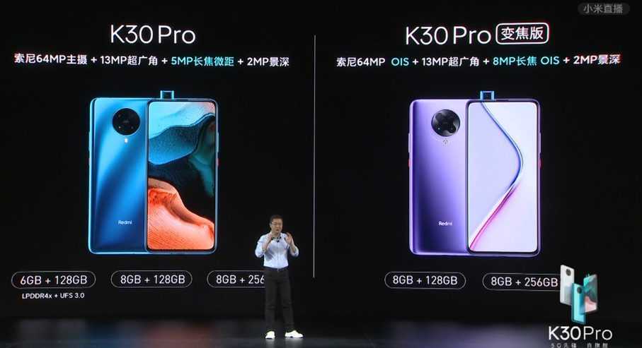 Существуют некоторые различия в конфигурации оборудования, так как стандартная версия Redmi K30 Pro начинается с комбинации 6 Гб + 128 Гб и использует оперативную памяти LPDDR4X + накопитель UFS 3.0, а версия Redmi K30 Pro ZOOM начинается с 8 Гб ОЗУ (LPDDR5) и 128 Гб накопителя (UFS 3.1).