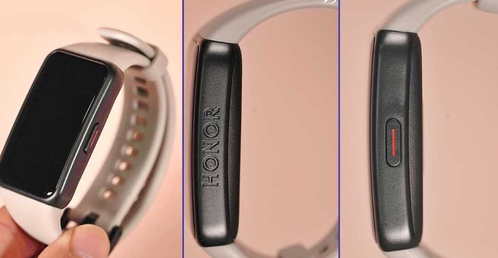 На правой боковой стороне HONOR Band 6 можно единственную кнопку управления. На поверхности можно видеть узкую красную полоску. Кнопка обеспечивает доступ к разнообразным пунктам меню и режимам. На левой боковой стороне браслета имеется оттиск с названием бренда.