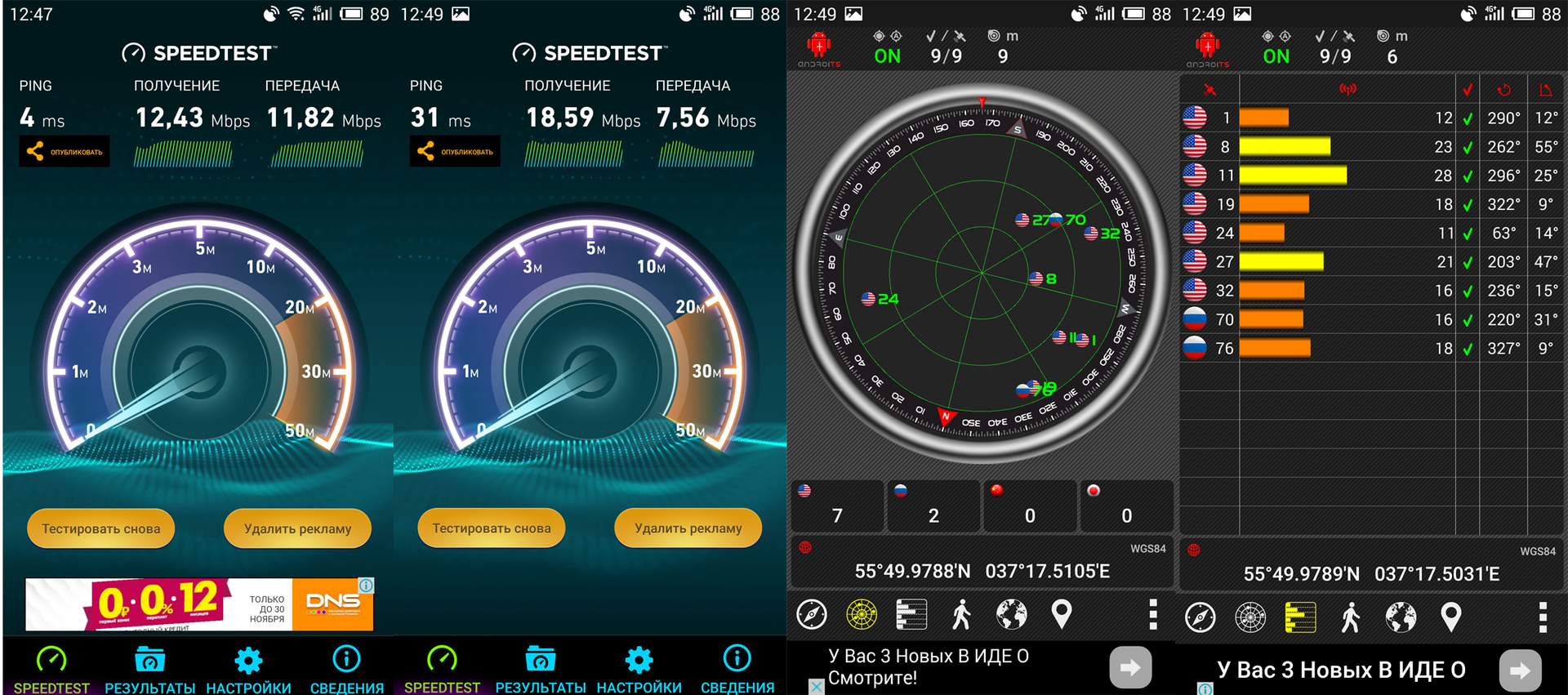 Сбоев в работе или с подключениями, связанными с модулями связи, замечено не было. Холодный старт GPS занимает около полутора минут, а горячий в районе полуминуты. Точность позиционирования отличная, трекинг при движении — плавный. Связь со спутниками смартфон старается держать устойчиво, в туннелях глубокого заложения или зданиях, конечно, уже соединение может прерываться или ухудшаться. Для лучшего понимания происходящего, скриншоты теста GPS сделаны в помещении типового панельного многоэтажного строения.
