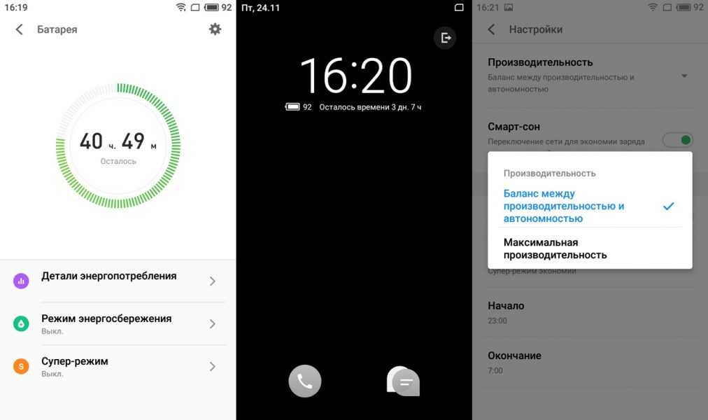 Для экономии заряда в настройках «Батареи» есть два режима энергосбережения (включая «Супер-режим»), уменьшающие потребление до минимально возможного, в зависимости от доступной функциональности гаджета. Здесь же, в зависимости от ситуации, можно остановиться на максимальной производительности, либо найти некий баланс между производительностью и автономностью.