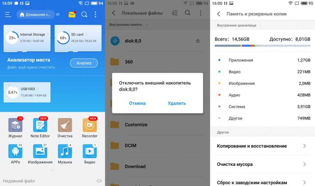 Из установленных 16 ГБ встроенной памяти доступными для пользования остаются около 10 ГБ. Для расширения хранилища предусмотрена установка карты памяти microSD/HC/XC максимальным объемом до 128 ГБ. Но заняв ей слот, придется отказаться от второй nanoSIM. Поддержка технологии USB-OTG позволяет подключать к смартфону USB-флешки.