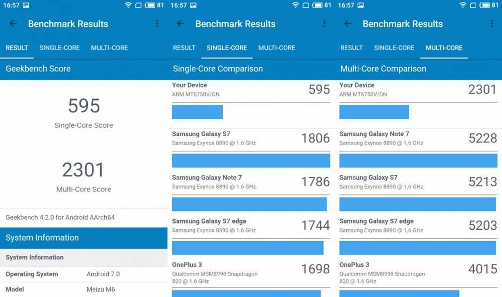 В М5 стоит вездесущий MediaTek MT6750, предназначенный для смартфонов, как раз-таки бюджетного класса и в М6 не стал исключением. Напомним, что процессор на этом кристалле, работающий в тандеме с графическим ускорителем ARM Mali-T860 MP2, состоит из двух квартетов ядер ARM Cortex-A53 с тактовой частотой до 1,5 ГГц и до 1,0 ГГц, соответственно. Чип MT6750, включающий в себя 4G-модем (LTE Cat.6), поддерживает дисплеи с разрешением до 1280×720 точек и 16-мегапиксельные камеры. В модификациях модели M6 с 16 ГБ/32 ГБ (eMMC 5.1) встроенного хранилища установлено 2 ГБ/3 ГБ (LPDDR3) оперативки, соответственно. У нас на тесте был аппарат с комбинацией 2 ГБ оперативкой и 16 ГБ встроенной памяти.