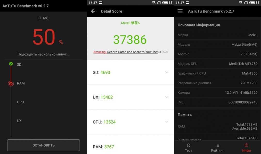 Аппаратная основа Meizu M10 – чипсет MediaTek Helio P25. Это немного разогнанная версия Helio P20, одним из первых смартфонов на базе которого был вышедший в конце 2016 года середняк Meizu M3X (Meilan X). Что до самого P25, то он использовался в младшей версии Meizu Pro 7, что вызывало недоумение уже тогда, в 2017 году. Как компания вспомнила про этот чипсет три (!!!) года спустя, я не представляю. Но, надо сказать, это большой прогресс в сравнении с Meizu C9, который вообще был основан на одном из чипсетов UNiSoC (в простонародье Spreadtrum). Объём оперативной памяти составляет 2/3 ГБ, постоянной – 32 ГБ. Посмотрим на скриншоты из бенчмарков: