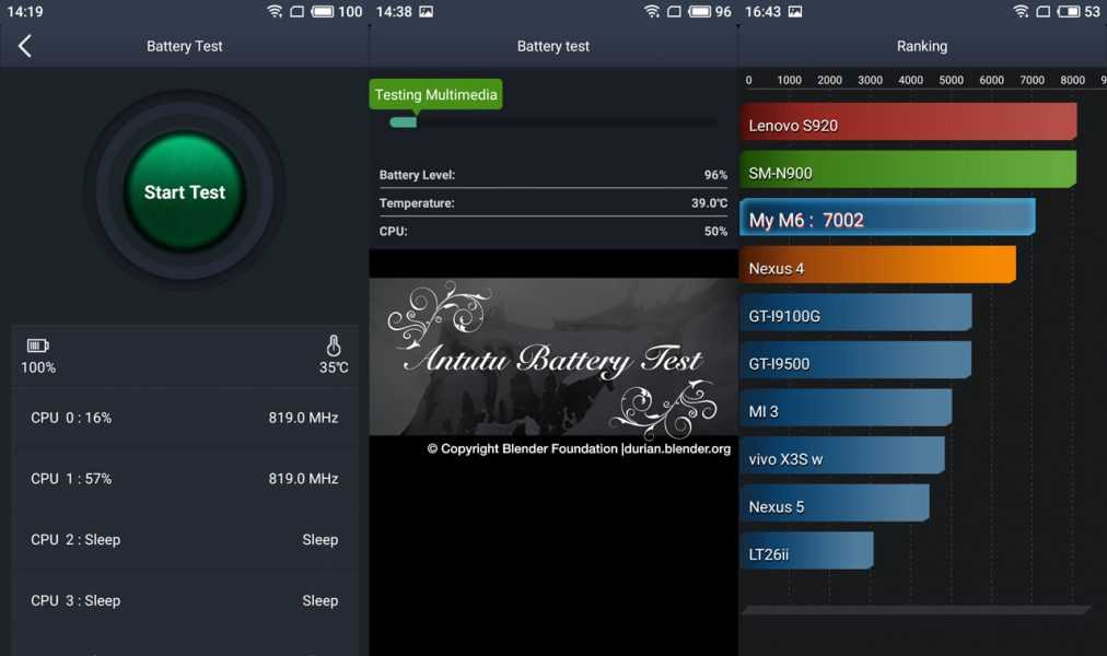 Тест AnTuTu Tester оценил работу аккумулятора в 7 002 балла. Набор из видеороликов в формате MP4 (аппаратное декодирование) и HD-качестве на полной яркости воспроизводится непрерывно в течение около 7 часов. Для бюджетника это, неплохой результат.