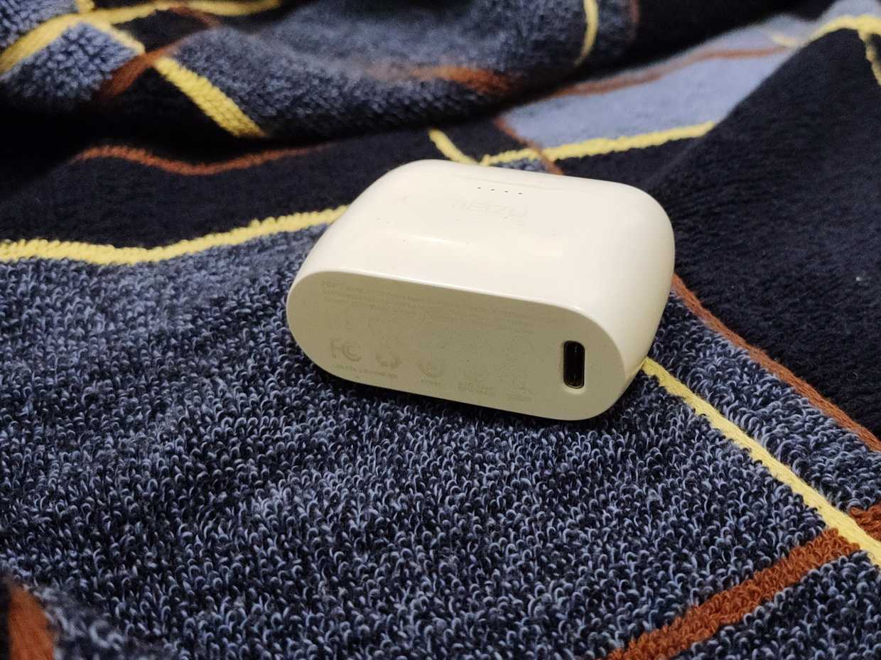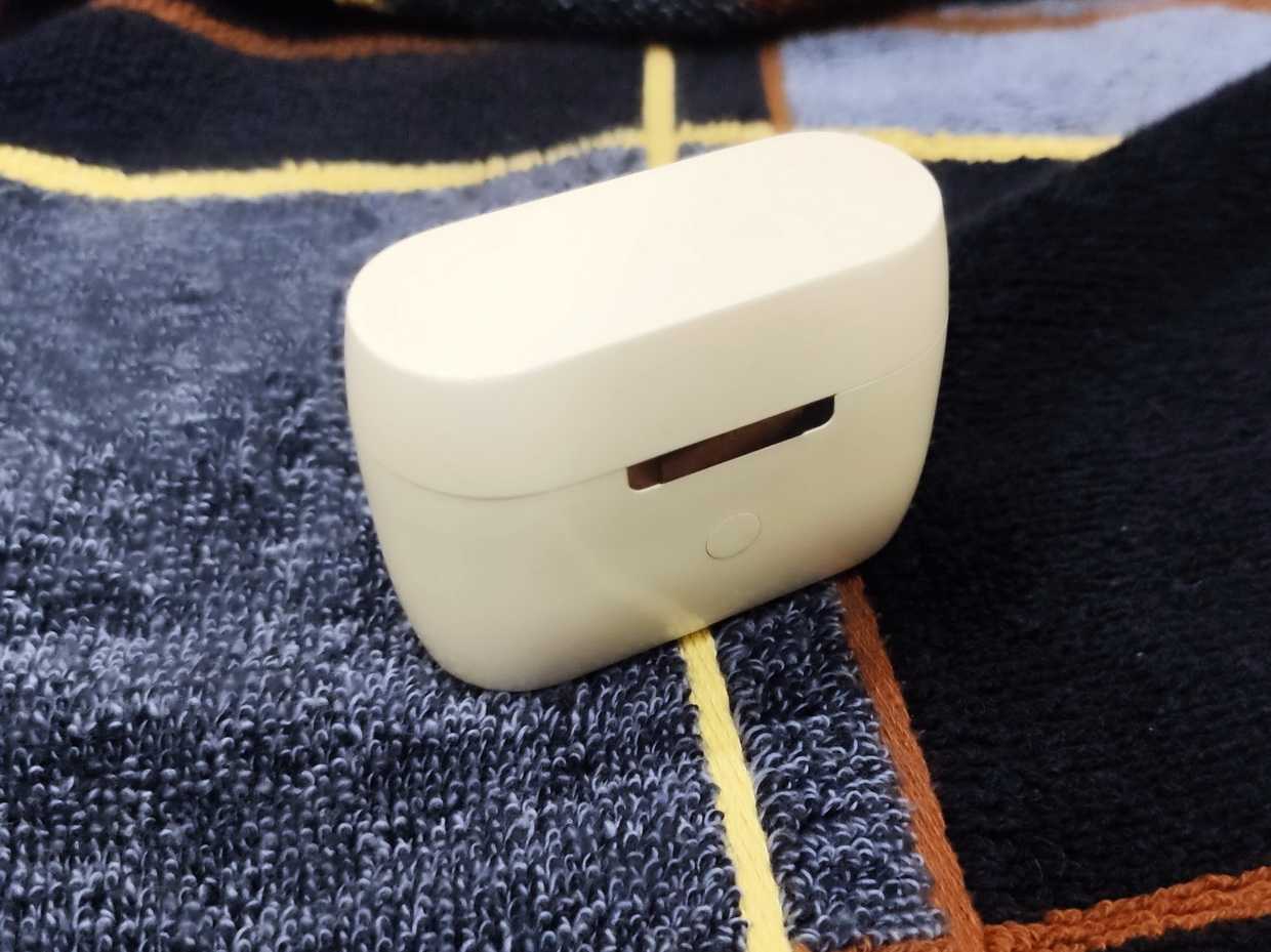 На лицевой поверхности кейса расположен логотип производителя. Сразу над ним размещен индикатор, показывающий уровень заряда. На тыльной стороне бокса размещена кнопка обнуления настроек и сброса сопряжения. Разъем для зарядки расположен внизу. Спорное решение, но можно привыкнуть.