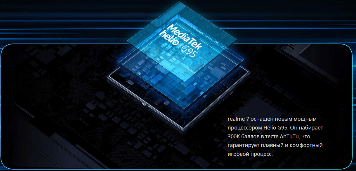 Телефон построен на базе микропроцессора Mediatek Helio G95, набирающего в тесте производительности AnTuTu около 300 тыс. баллов. Кристалл изготовлен по 12-нанометровому технологическому процессу и содержит 8 ядер (пару Cortex A76 частотой 2,05 ГГц и 6 шт. Cortex A55 частотой 2 ГГц). Для обработки графики использован чип Mali-G76, поддерживающий формат видео 8К.