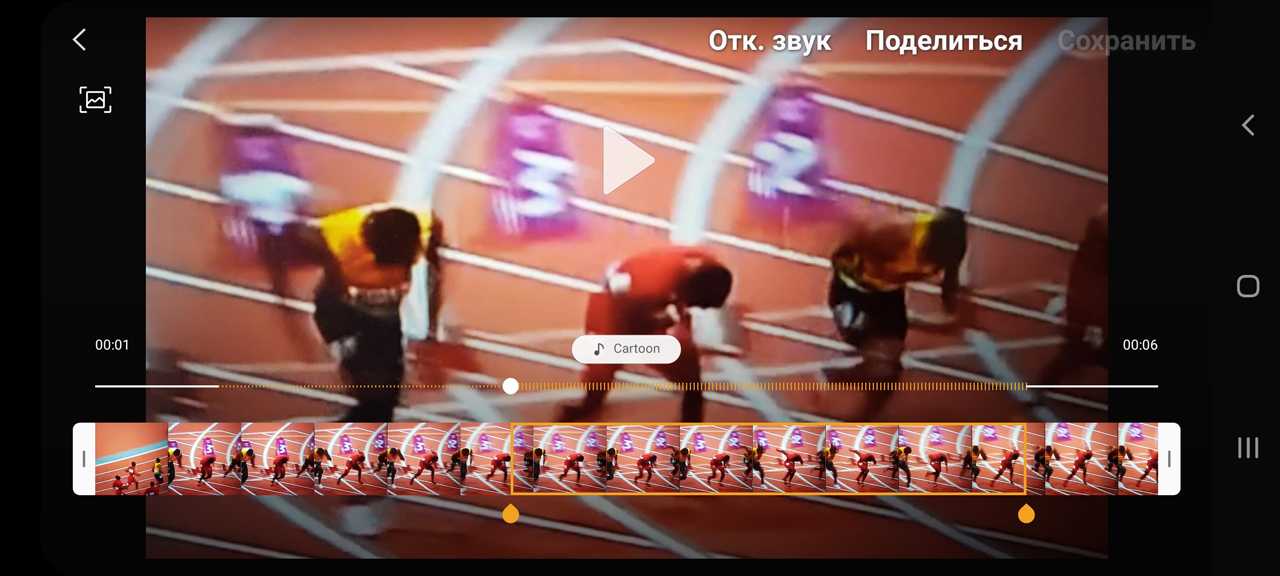 К сверхзамедленному видео автоматически добавляется дорожка фоновой музыки. В режиме воспроизведения можно редактировать и выбрать нужный фрагмент замедления.