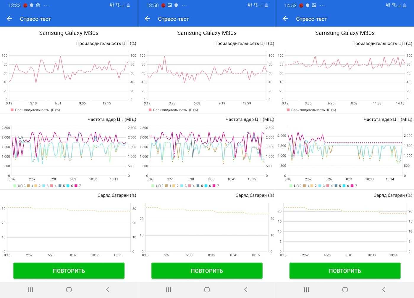 Хорошие показатели для относительно простой модели Samsung. Для игр мощности хватает, не всё пойдёт на максимальных настройках — например, тормозит PUBG, поэтому приходится переключаться на средние. Во время игр нагревается центральная и верхняя часть корпуса, а при постоянной нагрузке снижается производительность. Вот график для наглядности: