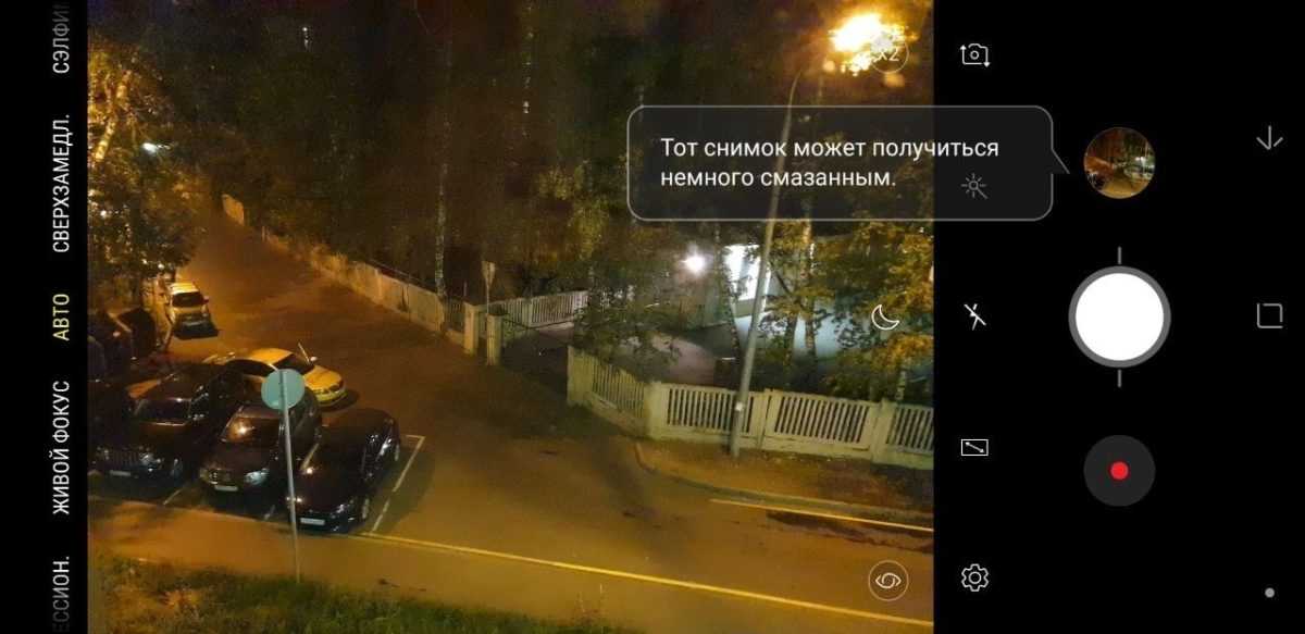 В программное обеспечение Note 9 добавили алгоритмы, которые могут распознавать неудачные фото. После съемки в приложении камеры появляется небольшая такая подсказка о том, что снимок размыт, засвечен или на нём кто-то успел моргнуть. Удобно — не нужно лишний раз открывать галерею, чтобы проверить качество снимка.