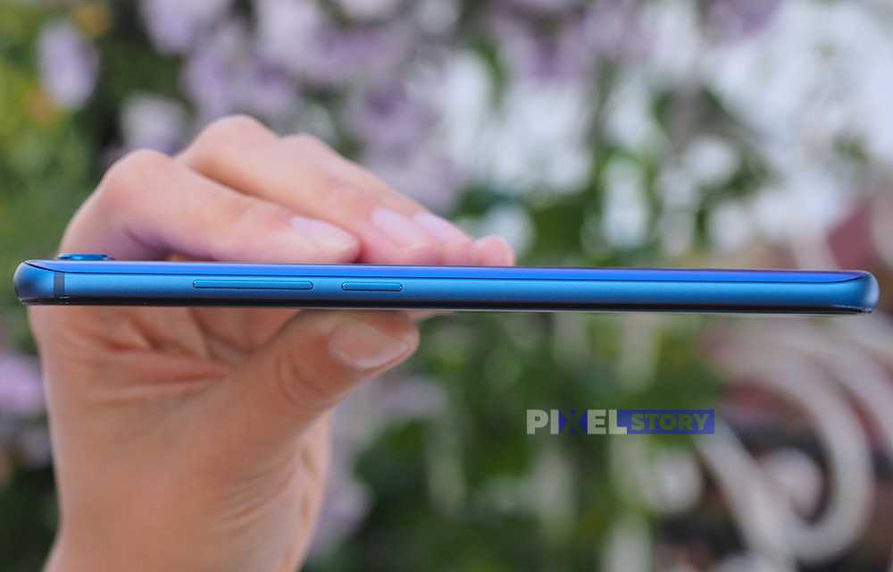 Размеры у мобильника вполне комфортные — 154.8 х 73.64 х 7.95 мм, вес 164 грамм. Аппарат не кажется избыточно большим и огромным. Во многом это связано с тем, что 90% лицевой поверхности занимает сенсорный экран с диагональю 6,21 дюйма, вытянутый по длине (соотношение сторон 19,5:9). Можно отметить небольшие кромки: сверху, слева и справа — порядка 2 мм, снизу – около 7 мм. За счёт такой компоновки полезная поверхность на передней части аппарата действительно максимальна.