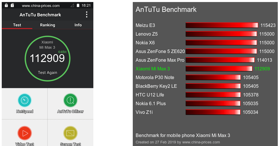 При тестировании в бенчмарке AnTuTu Ми Макс 3 выдает около 112 тыс. баллов. Этот показатель является неплохим для смартфонов среднего ценового сегмента.