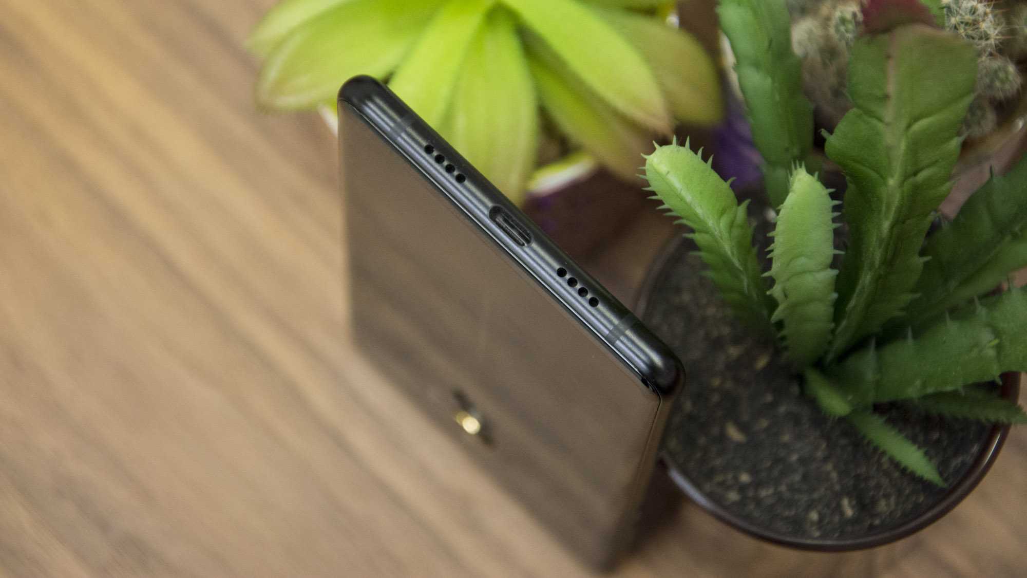 Второе. Верхняя рамка стала чуть больше, но все еще недостаточна для размещения датчиков, камеры и динамика. Поэтому последний прячется на торце смартфона (все же лучше, чем разрывающий экран динамик новых iPhone). Фронтальная камера за отсутствием места сверху все так же на нижней кромке рядом с 3-цветным LED-индикатором. Не лучшее решение, и текущий дизайн другого не предлагает.