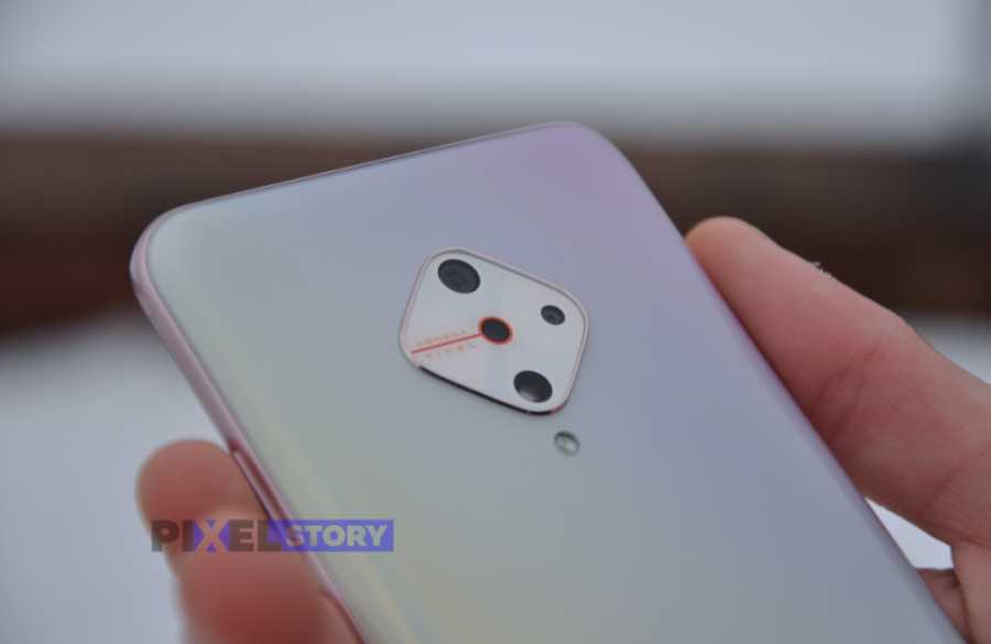 Скомпонованный в виде ромба блок камер в перламутровом корпусе смартфона получил белый цвет, в фиолетово-синем — черный. Сами камеры расположены треугольником, и к центральному объективу от края ромба тянется тонкая полоска с надписью, напоминающей о том, что разрешение одной из камер — 48 мп.