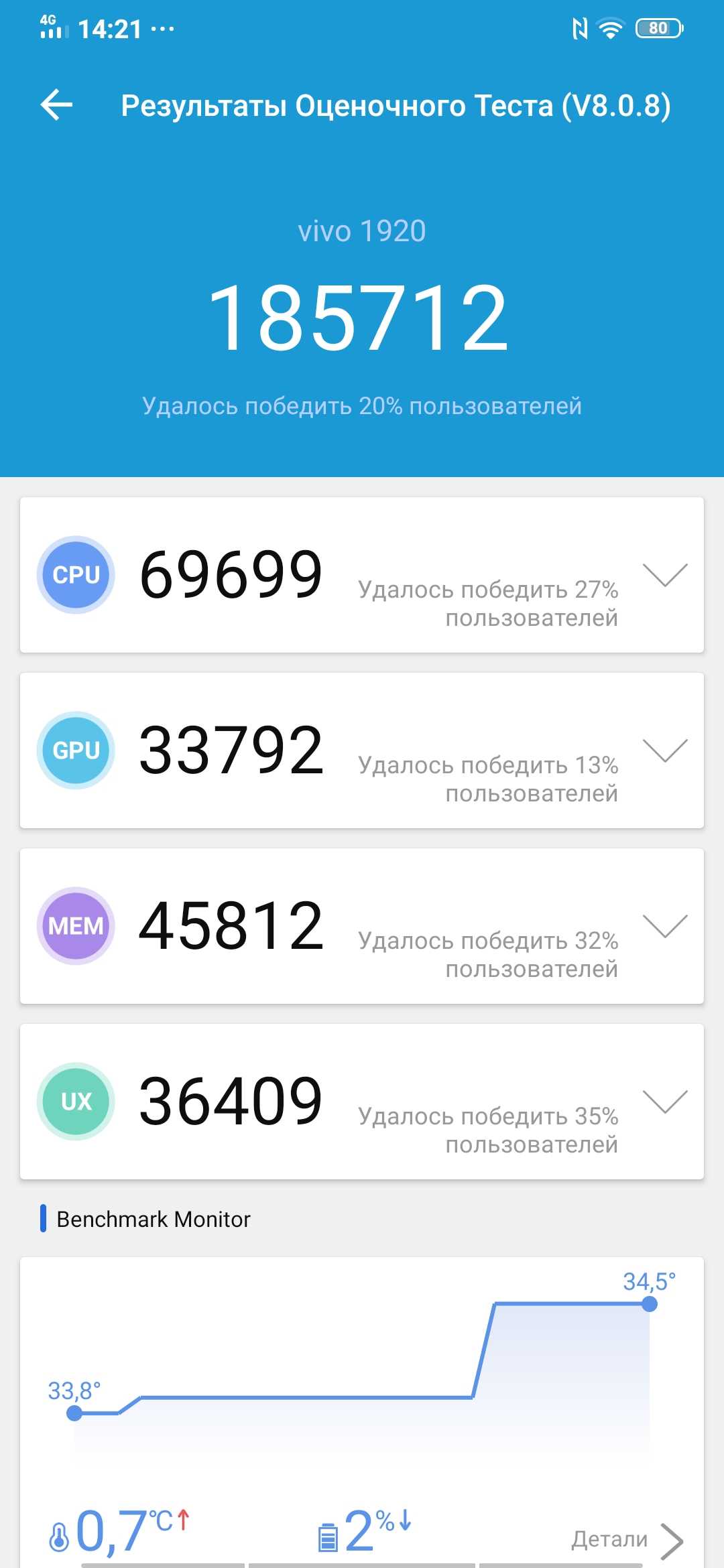 Система работает шустро, приложения, в том числе браузеры, не тормозят. Реакции на нажатия и жесты — без задержек. В синтетическом тесте V17 обошел, например, своего прямого конкурента Samsung Galaxy A50.