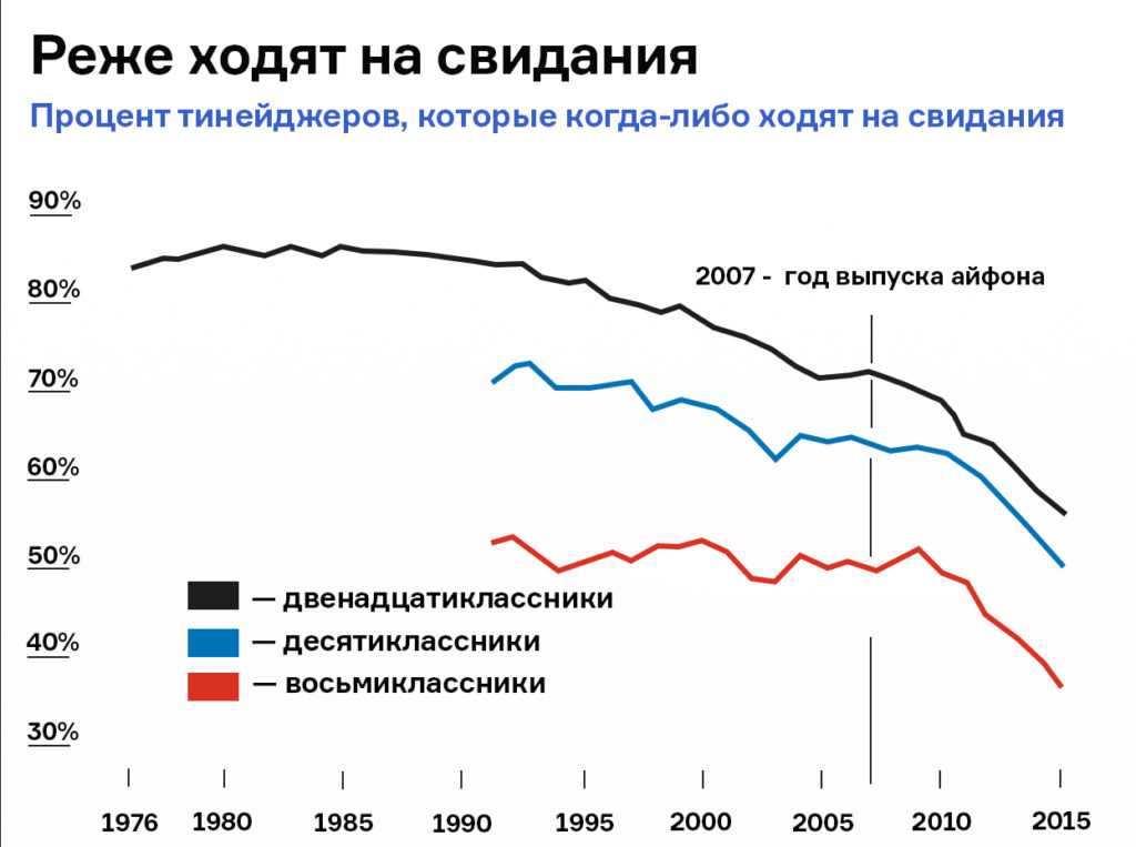 Процент учеников восьмого, десятого и двенадцатого классов (13, 15 и 17 лет соответственно), которые хотя бы раз ходили на свидание. Источник