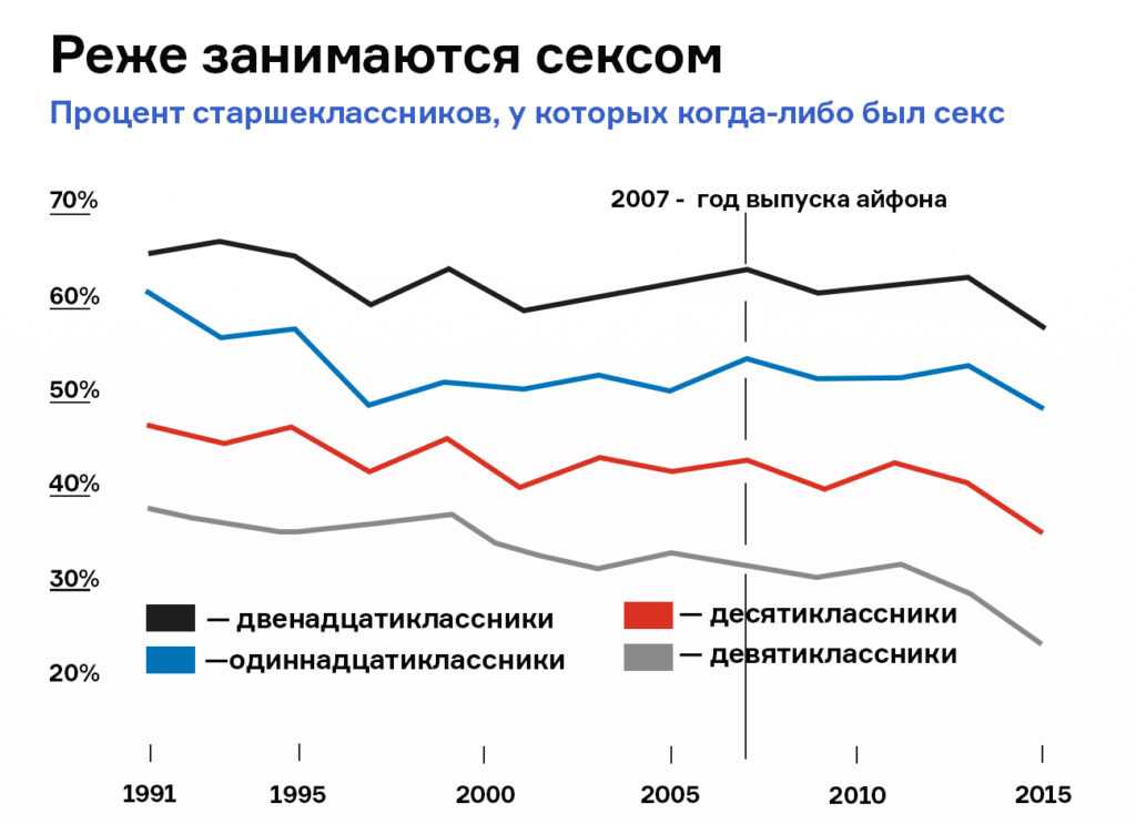Процент учеников с восьмого по двенадцатый класс, которые хотя бы раз занимались сексом. Источник