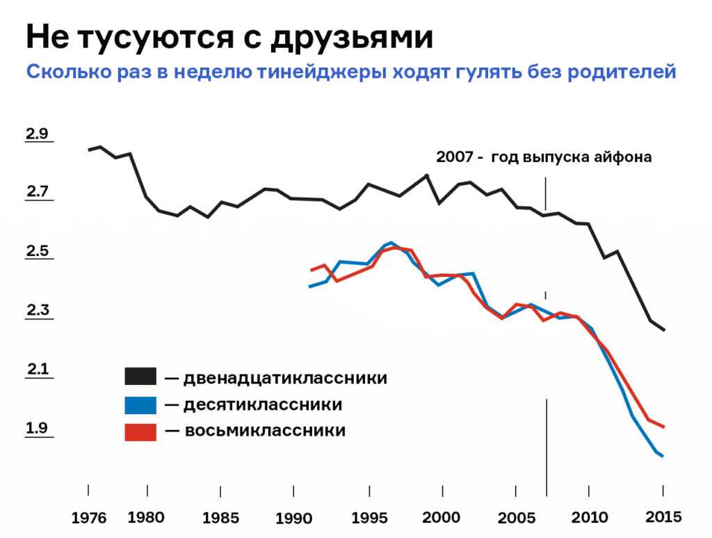 Родители старшеклассников качают головой — мол, в ваши годы мы дома только спали, а вы с дивана не встаете, уткнувшись в телефон! По наблюдениям профессора психологии Джин Твенге, подростки действительно стали меньше выходить на улицу, чтобы провести время с друзьями.