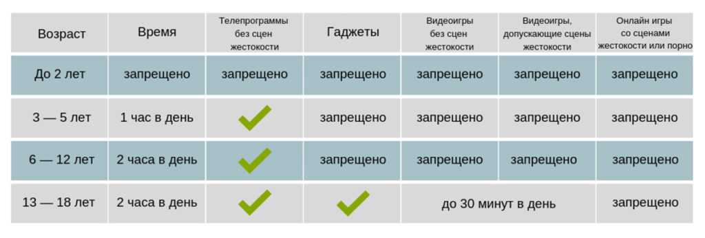 Американская академия педиатрии рекомендует детям с трех до пяти лет проводить у экрана не больше часа в день, с шести до восемнадцати — два часа, включая выполнение домашнего задания. Другие эксперты строже: лимит просмотра в три-пять лет — 20 минут в день, в семь-десять лет — час. Но абсолютно все медики уверены, что до двух лет ребенок вовсе не должен контактировать с гаджетами.