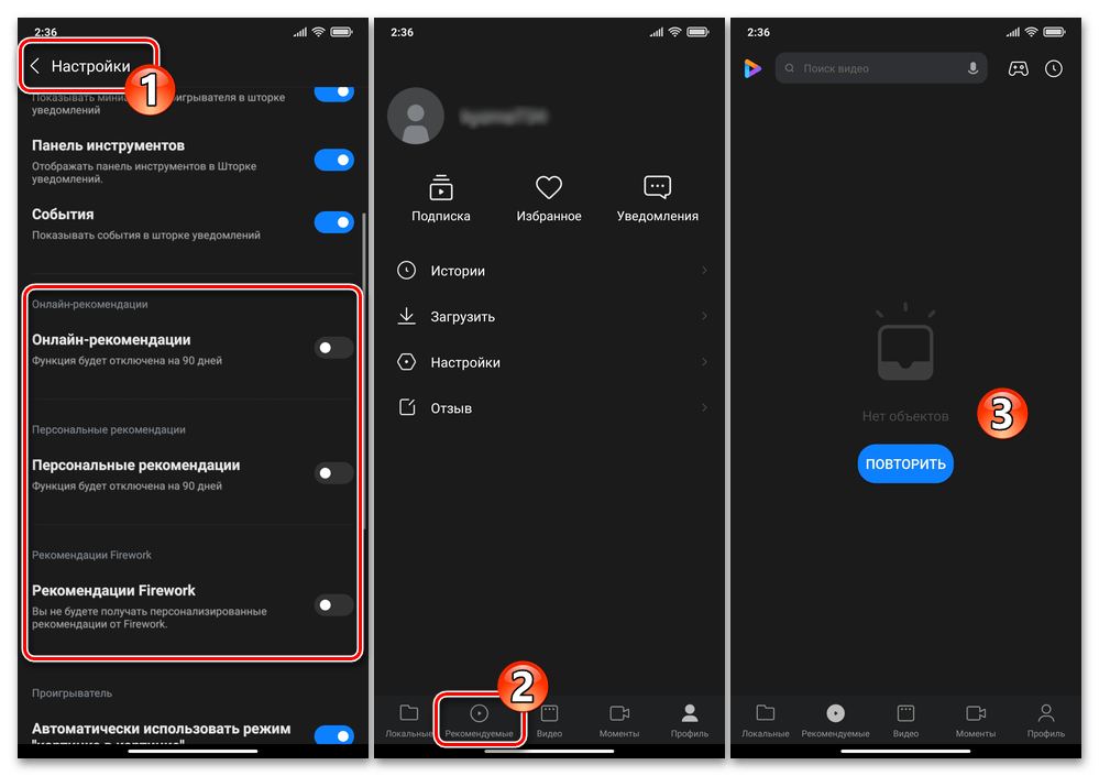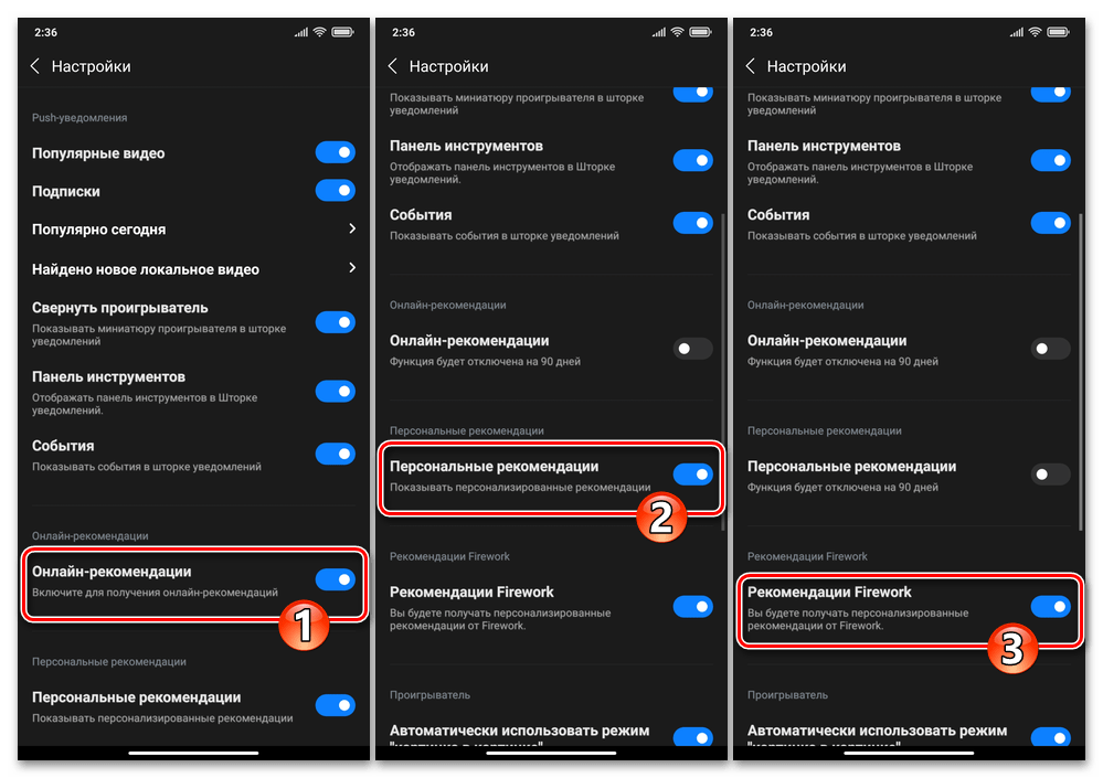 В перечне, который предстанет перед вами в результате, необходимо отключить три опции: «Онлайн-рекомендации», «Персональные рекомендации», а также «Рекомендации Firework».