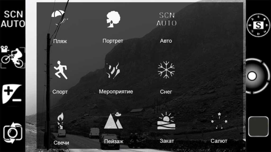 3. Затем нужно выйти из настроек и снова свайпнуть вниз. Открываем вкладку «Сцены» и указываем желаемый вариант: портрет, пейзаж, спорт и т.д. Софт автоматически установит подходящие параметры экспозиции, контраста и выдержки. По сути нужно выбрать тематический фильтр, чтобы лучше передать атмосферу кадра и избежать графических дефектов.