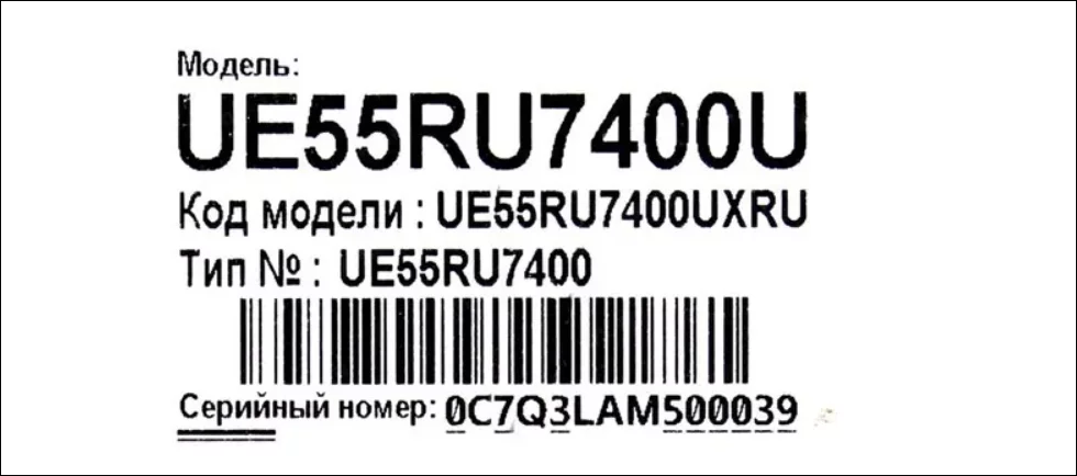 Маркировка телевизора Samsung располагается в трех экземплярах в виде наклейки со штрихкодом, номером модели и серией. Найти маркировку можно на заводской коробке, в сервисной книге и на задней крышке самого телевизора. Номер модели на маркировке может содержать от 10 до 16 символов, которые и позволяют прочитать основную информацию об устройстве. Выглядит маркировочная наклейка следующим образом: