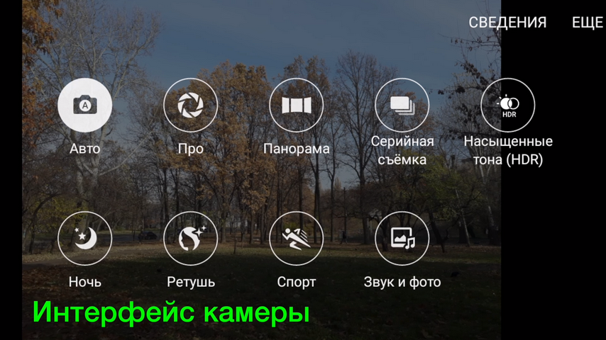 Кроме привычного автоматического режима в камере есть режимы панорамы, серийной съемки, HDR, ночной, спорт. Режим Про позволяет настроить баланс белого, ISO, экспокоррекцию и способ измерения экспозиции, без возможности ручной фокусировки.
