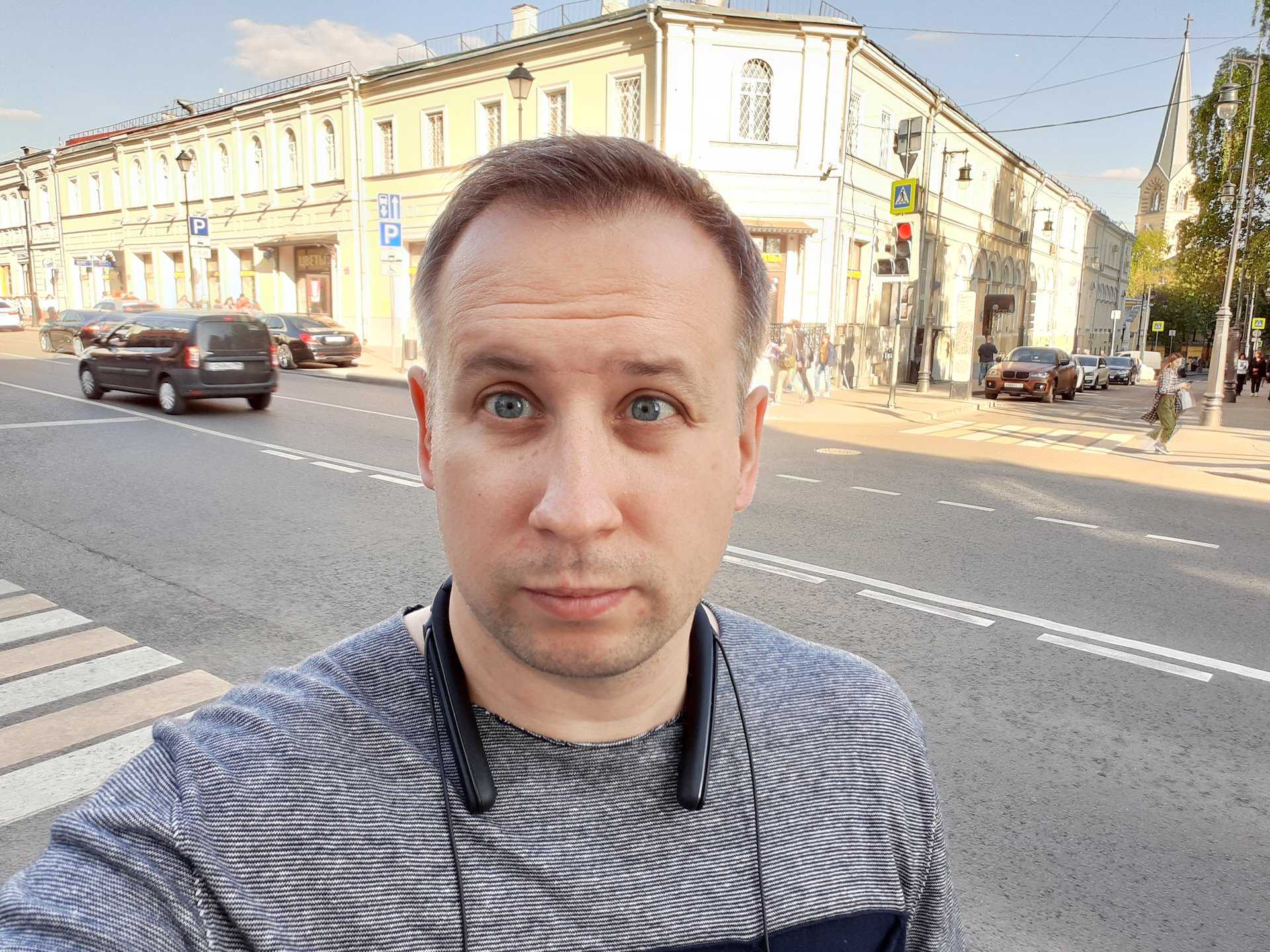 Фронтальная камера без особых наворотов: нет ни автофокуса, ни вспышки, хотя для смартфона такого уровня это простительно. Причём отсутствие вспышки можно компенсировать таким трюком: при необходимости экран на мгновение сияет белым светом во всю силу и подсвечивает лицо. Сделать хорошее селфи при отличном освещении легко, что я и опробовал на нашем студийном свете.