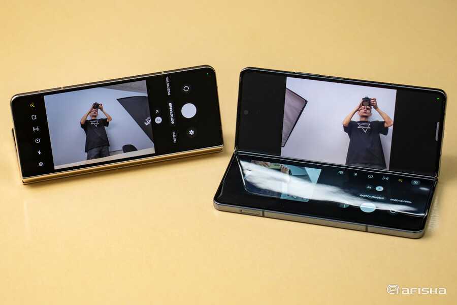 Необычный форм-фактор смартфона наложил отпечаток и на процесс фото-, видеосъёмки. Можно вывести на пол-экрана превью сделанных снимков, отобразить интерфейс в режиме сгибания и дублировать видеоискатель на внешний дисплей.