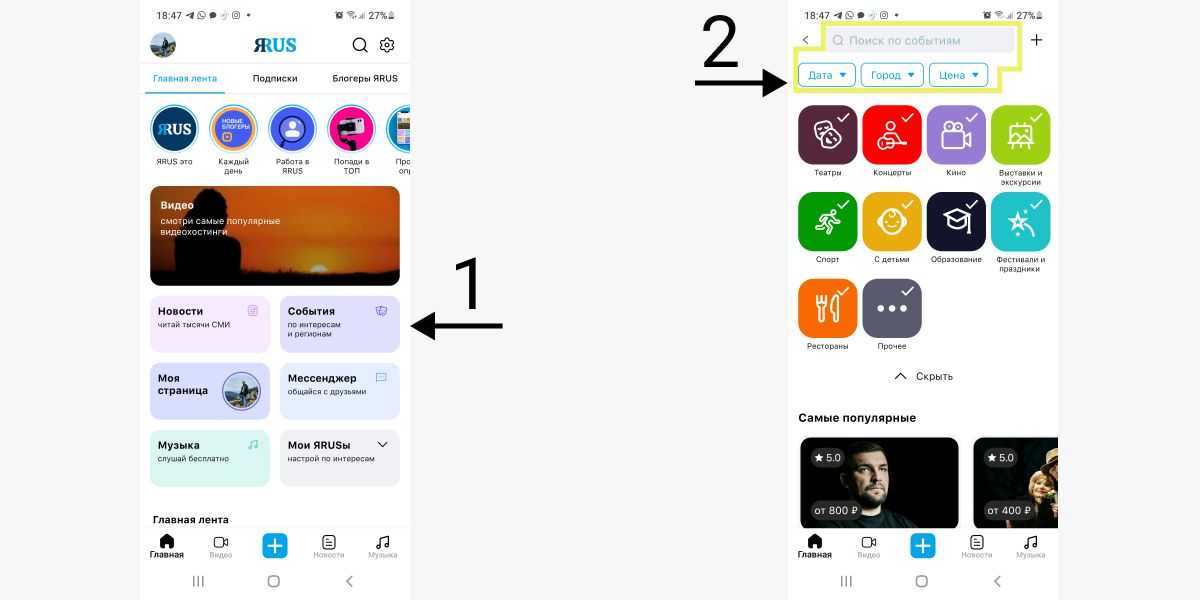 Вкладка «События» поможет найти культурные мероприятия как в вашем городе, так и остальных городах России.
