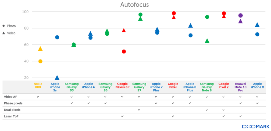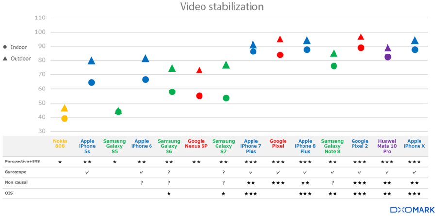 Балл и оценка DxOMark Camera Video включает шесть таких же баллов, что и оценка DxOMark Mobile Photo (экспозиция, цвет, автофокус, текстура, шум и артефакты), а также стабилизация.