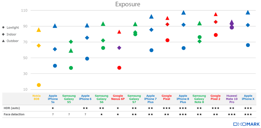 Балл и оценка Camera Photo от DxOMark представляет собой запатентованную комбинацию из девяти суббаллов категорий: