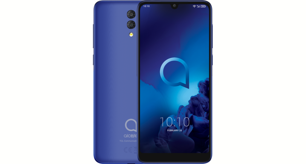Визуально эта модель мало чем отличается от оформления выпускаемых сейчас смартфонов. Практически вся лицевая сторона отведена под дисплей (рамки есть, но едва видимые). Есть вырез-капля под фронтальную камеру. Доступные цвета: черный, синий, белый.
