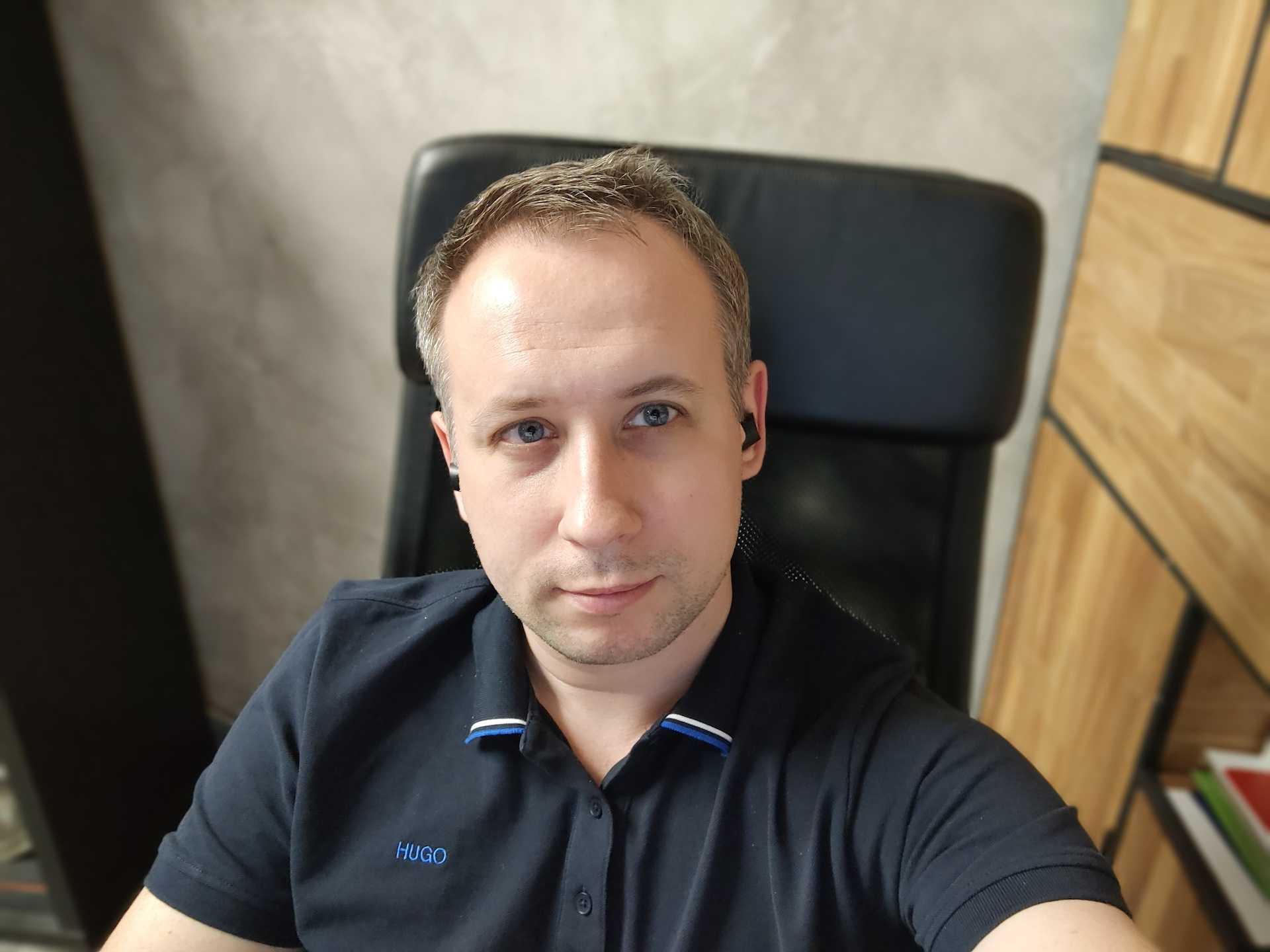 Фронтальная камера отлично снимает при дневном свете, при искусственном освещении она тоже не подводит. Вот пример с портретным режимом, когда искусственно замыливается фон. Обработка аккуратная, софт хорошо справляется с полосами и ушами, стараясь не обрезать ничего лишнего: