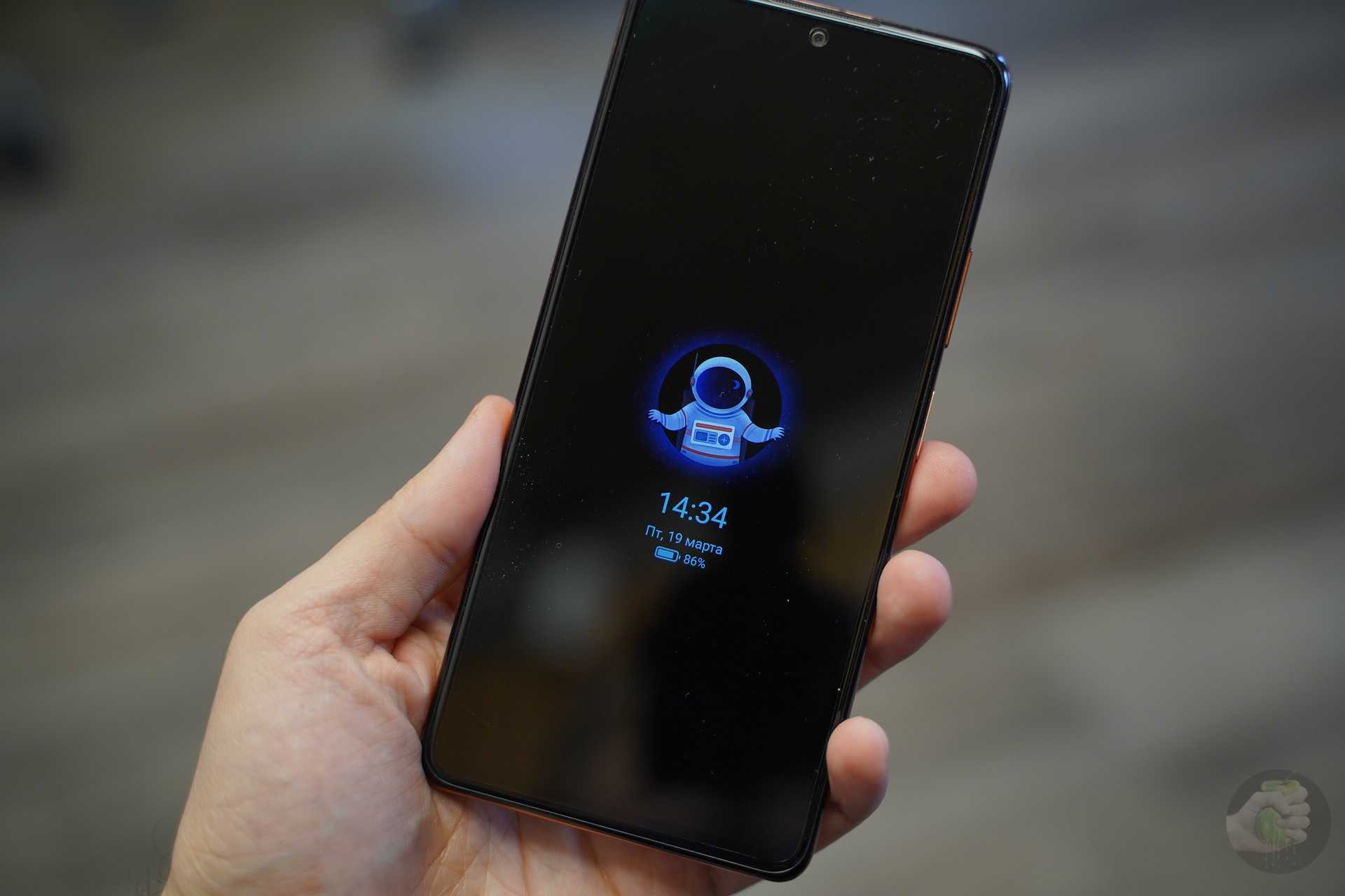 Как мы отмечали ранее, в верхней части дисплея присутствует отверстие под фронтальную камеру. Слева и справа от выреза отображаются индикаторы работы сети, приложений, время и т.п. Если вам в глаза бросается отверстие, его можно скрыть. Делается это в пункте «Экран» — «Центр управления и строка состояния» — «Скрытие выреза» в основных настройках. Здесь можно замаскировать вырез в экране чёрной заливкой по его бокам — всё будет выглядеть так, словно у смартфона классический верхний отступ, поверх которого отображаются индикаторы и значки уведомлений. Можно сделать вырез каплевидным.